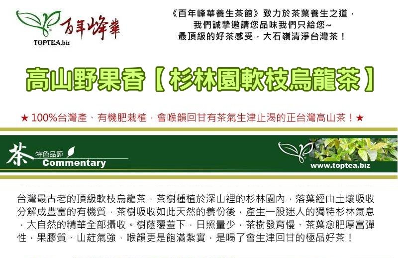 高山野果香【杉林園軟枝烏龍茶】台灣最古老的頂級軟枝烏龍茶,茶樹種植於深山裡的杉林園內,落葉經由土壤吸收分解成豐富的有機質,茶樹吸收如此天然的養份後,產生一股迷人的獨特杉林氣息,大自然的精華全部攝收。樹蔭覆蓋下,日照量少,茶樹發育慢、茶葉愈肥厚富彈性,果膠質、山葒氣強,喉韻更是飽滿紮實,是喝了會生津回甘的極品好茶!